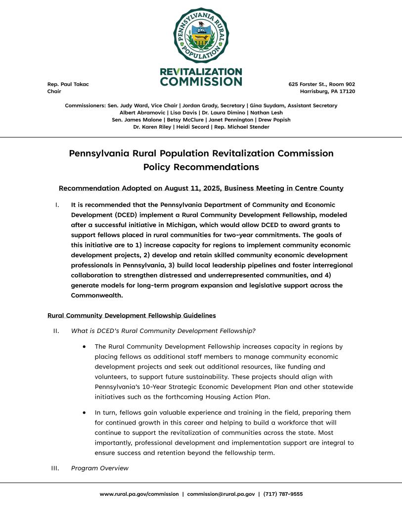 Pennsylvania Rural Population Revitalization Commission Policy Recommendations - August 11, 2025
