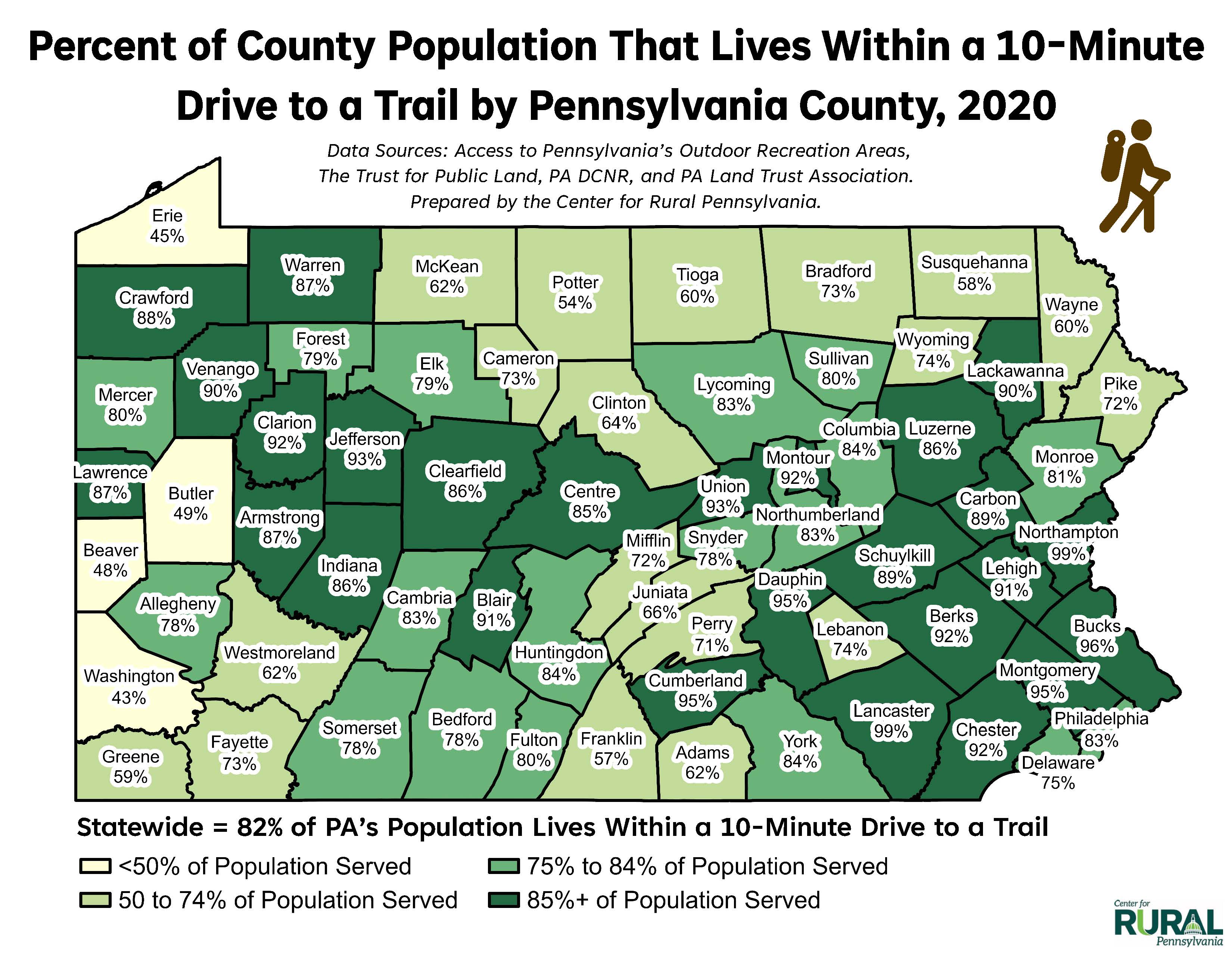 Percent of County Population That Lives Within a 10-Minute Drive to a Trail by Pennsylvania County, 2020
