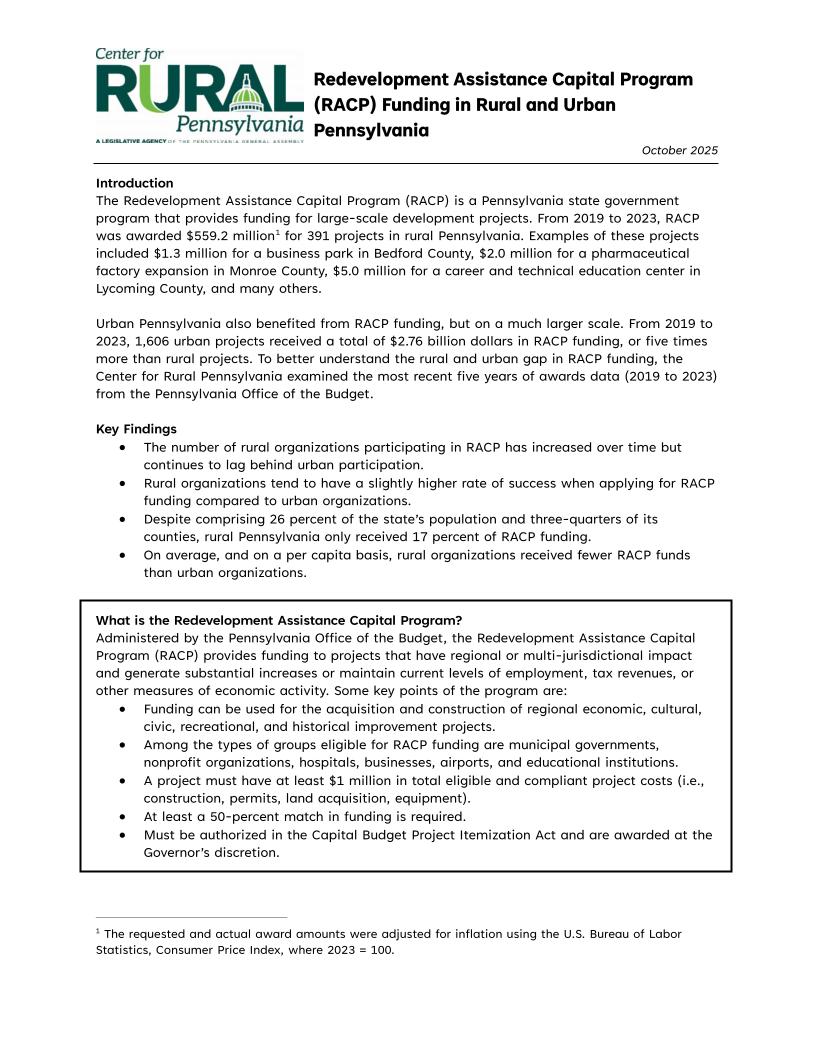Redevelopment Assistance Capital Program (RACP) Funding in Rural and Urban Pennsylvania