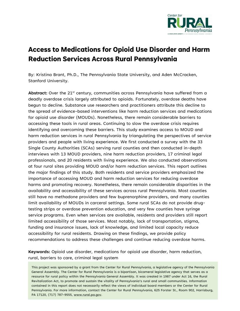 Over the 21st century, Pennsylvania communities have faced a severe opioid-driven overdose crisis, though deaths are now declining thanks to evidence-based interventions such as harm reduction services and medications for opioid use disorder (MOUD). However, major barriers persist in rural areas. This study examines access to MOUD and harm reduction services in rural Pennsylvania through surveys of 33 Single County Authorities, interviews with 59 stakeholders, including providers, criminal legal professionals, and residents with living experience, and site observations at four service locations. Findings show significant disparities in service availability, as many rural counties lack methadone or buprenorphine providers, have limited MOUD access in carceral settings, and few offer syringe services or drug-testing strips. Even where programs exist, transportation challenges, stigma, funding and insurance gaps, limited awareness, and scarce local capacity hinder access. The report concludes with policy recommendations to overcome these barriers and sustain progress in reducing overdose deaths.
