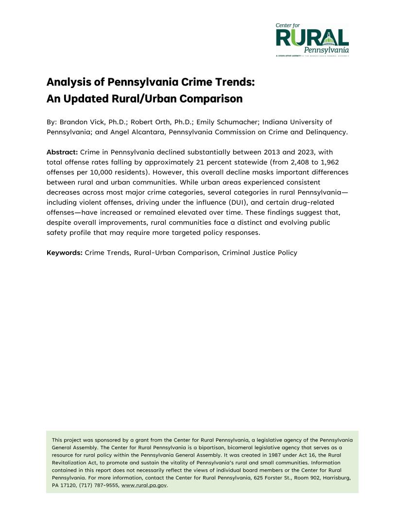 Crime in Pennsylvania declined substantially between 2013 and 2023, with total offense rates falling by approximately 21 percent statewide (from 2,408 to 1,962 offenses per 10,000 residents). However, this overall decline masks important differences between rural and urban communities. While urban areas experienced consistent decreases across most major crime categories, several categories in rural Pennsylvania—including violent offenses, driving under the influence (DUI), and certain drug-related offenses—have increased or remained elevated over time. These findings suggest that, despite overall improvements, rural communities face a distinct and evolving public safety profile that may require more targeted policy responses.