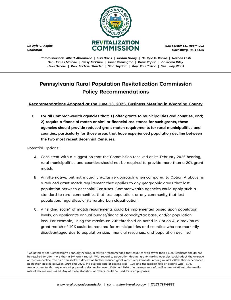 Pennsylvania Rural Population Revitalization Commission Policy Recommendations -June 13, 2025
