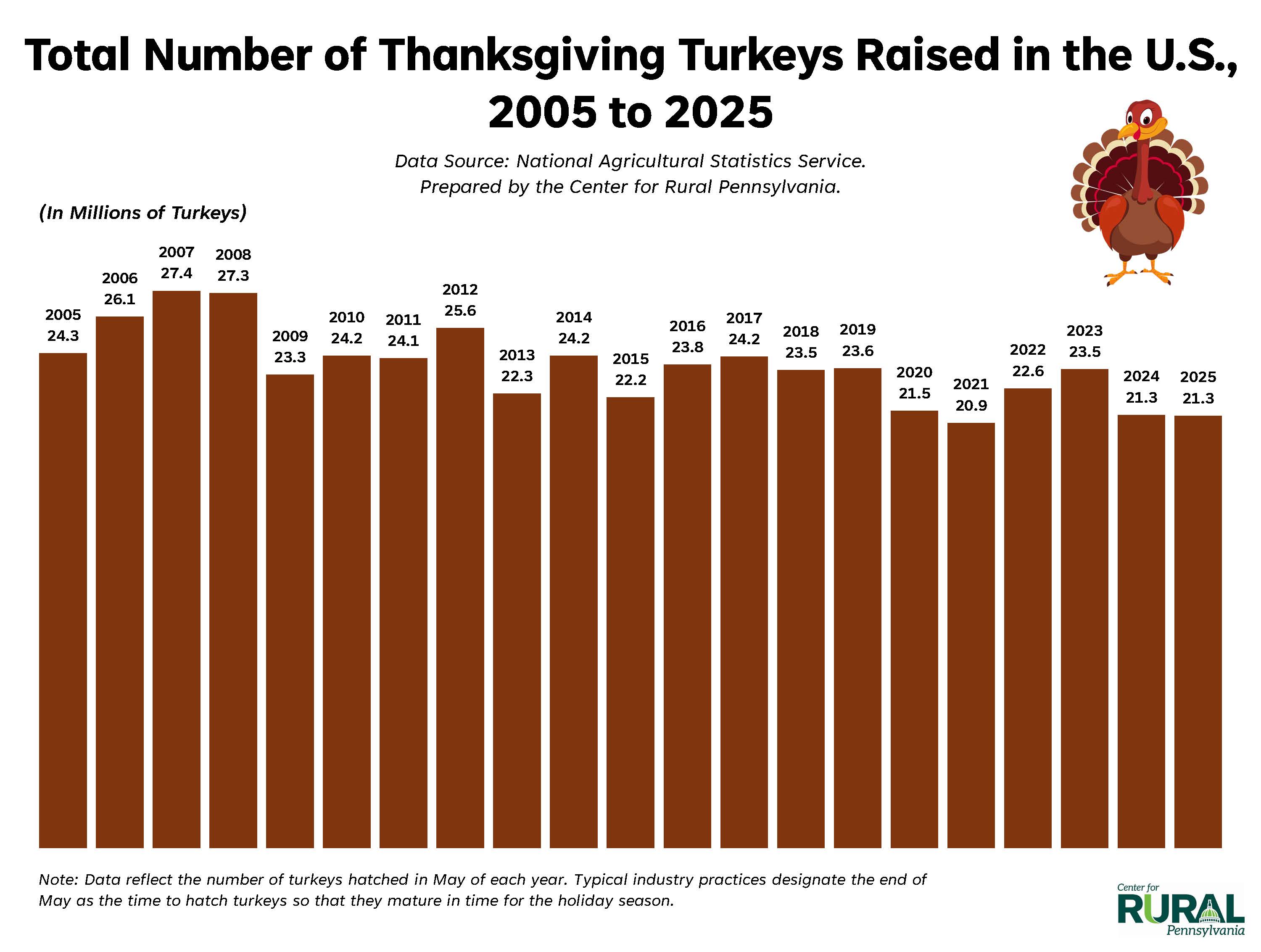 Total Number of Thanksgiving Turkeys Raised in the U.S., 2005 to 2025