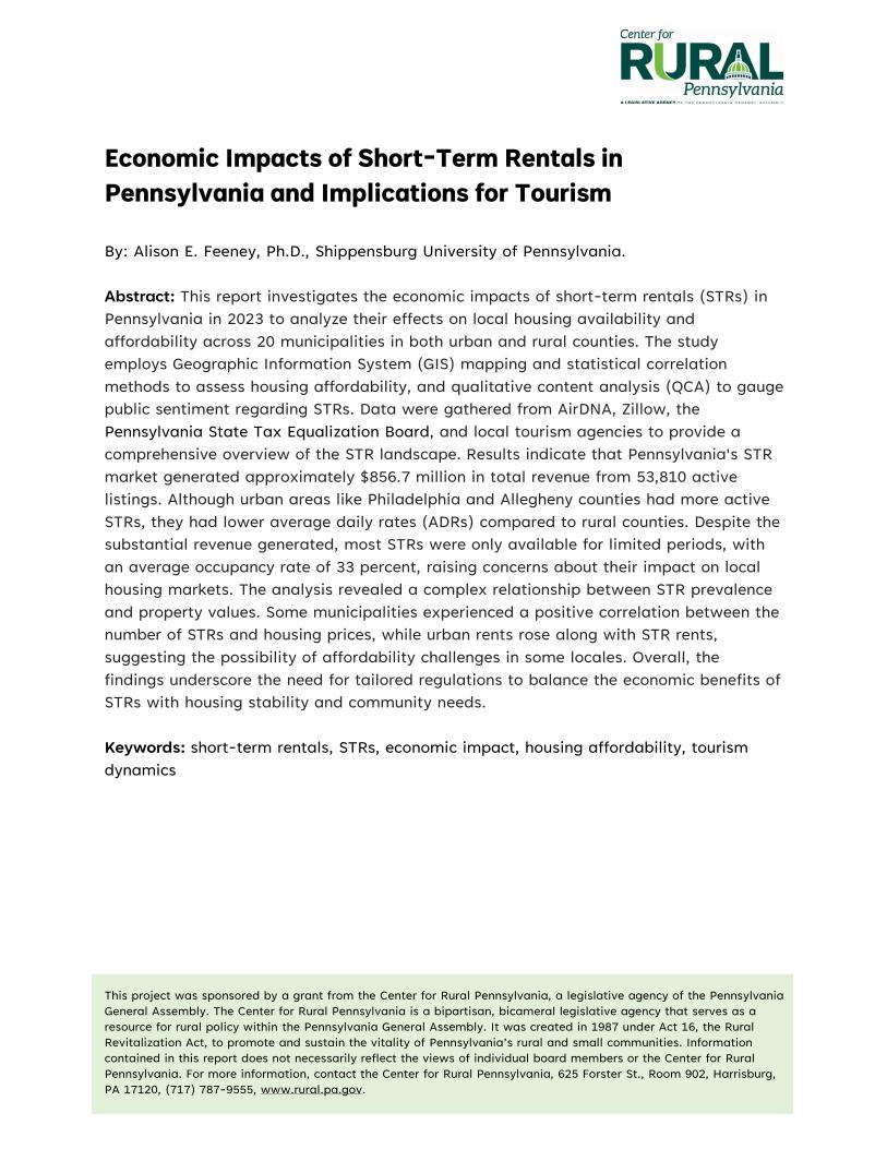 Economic Impacts of Short-Term Rentals in Pennsylvania and Implications for Tourism