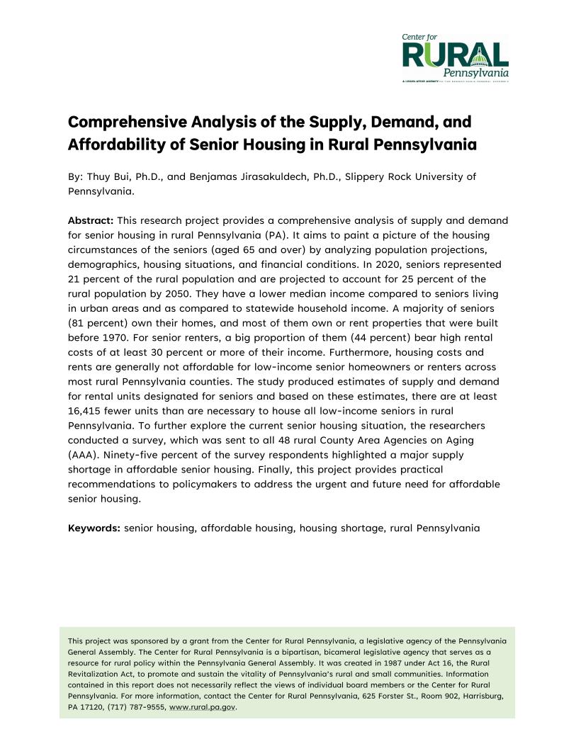 This research project provides a comprehensive analysis of supply and demand for senior housing in rural Pennsylvania (PA). It aims to paint a picture of the housing circumstances of the seniors (aged 65 and over) by analyzing population projections, demographics, housing situations, and financial conditions. In 2020, seniors represented 21 percent of the rural population and are projected to account for 25 percent of the rural population by 2050. They have a lower median income compared to seniors living in urban areas and as compared to statewide household income. A majority of seniors (81 percent) own their homes, and most of them own or rent properties that were built before 1970. For senior renters, a big proportion of them (44 percent) bear high rental costs of at least 30 percent or more of their income. Furthermore, housing costs and rents are generally not affordable for low-income senior homeowners or renters across most rural Pennsylvania counties. The study produced estimates of supply and demand for rental units designated for seniors, and based on these estimates, there are at least 16,415 fewer units than are necessary to house all low-income seniors in rural Pennsylvania. To further explore the current senior housing situation, the researchers conducted a survey, which was sent to all 48 rural County Area Agencies on Aging (AAA). Ninety-five percent of the survey respondents highlighted a major supply shortage in affordable senior housing. Finally, this project provides practical recommendations to policymakers to address the urgent and future need for affordable senior housing.